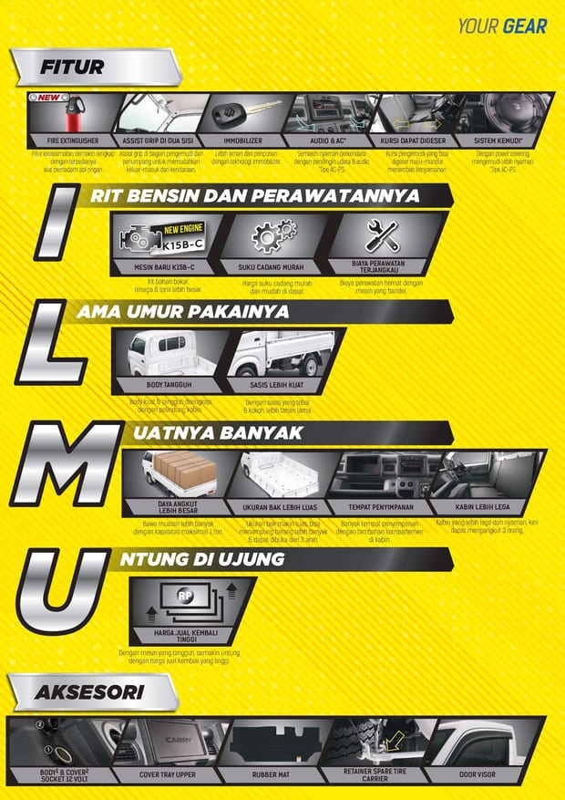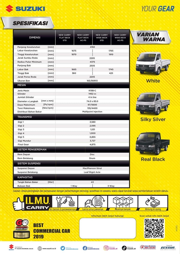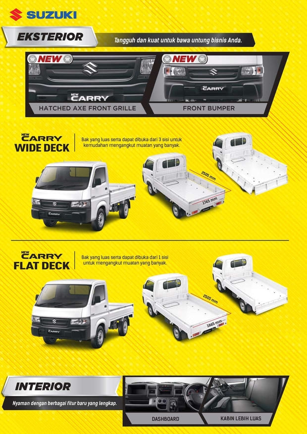 Di Indonesia sendiri, Carry terdiri dari dua jenis, yakni MVP dan Pick Up. Pada kesempatan kali ini, kita akan mendedah lebih dalam terkait model kedua. Seperti yang kita tahu, dalam beberapa waktu belakangan, Carry Pick Up mulai meredup pamornya karena kompetitor lain banyak yang melakukan penetrasi dengan model-model yang dikeluarkan. Demi menyongsong tahun 2017 kemarin, tepatnya di awal tahun, Suzuki Indomobil Sales (SIS), selaku distributor dan agen tunggal Suzuki di Indonesia, meluncurkan New Carry Pick Up sebagai jawaban atas kompetitor sekaligus pembuktian bahwa Pick Up truck ini masih layak untuk diperhitungkan.